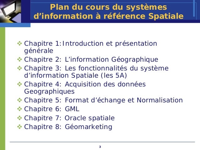 Présentation générale du système d'information Selon WIKIPEDIA, un système d'information est un ensemble de moyens techniques, administratifs, et humains qui servent à la collecte, au classement et à la transmission d'informations entre les membres d'une organisation (institution, entreprise, association,) L'utilisation de moyens informatiques, électroniques et la. Les Systèmes d'Information géographique vous permettent • de disposer les objets dans un système de référence géoréférencé, • de convertir les objets graphiques d'un système à un autre • de facilite la superposition de cartes de sources différentes • d'extraire tous les objets géographiques situés à une distance donnée d. Ce cours a pour objectif de maîtriser les méthodes et techniques associées à l'utilisation de données référées spatialement afin de répondre à des requêtes et analyses particulières De plus, il familiarise l'étudiant à l'exploitation d'un ensemble de données simultanément.