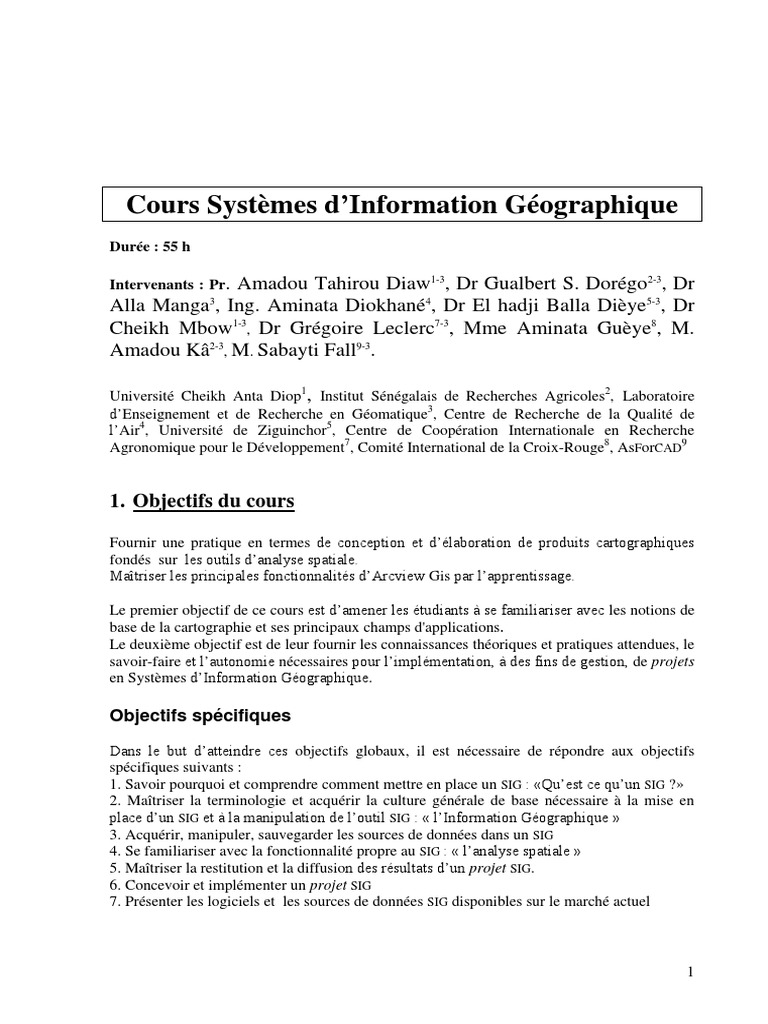 Ce cours a pour objectif de maîtriser les méthodes et techniques associées à l'utilisation de données référées spatialement afin de répondre à des requêtes et analyses particulières De plus, il familiarise l'étudiant à l'exploitation d'un ensemble de données simultanément. 123 Terminologie relative aux systèmes d’information Un SIRS Systèmes d’Information à Référence Spatiale est caractérisé par le rattachement de chaque donnée à une position dans l’espace Un SIG Système d’Information Géographique est un système d’information pour lequel la Terre est l’objet de référence fondamental. Cours Systèmes d’Information Géographique Durée 55 h Intervenants Pr Amadou Tahirou Diaw13, Dr Gualbert S Dorégo23, Dr Alla Manga3, Ing Aminata Diokhané4, Dr El hadji Balla Dièye53, Dr Cheikh Mbow13, Dr Grégoire Leclerc73, Mme Aminata Guèye8, M Amadou Kâ23, M Sabayti Fall93 Université Cheikh Anta Diop1,.