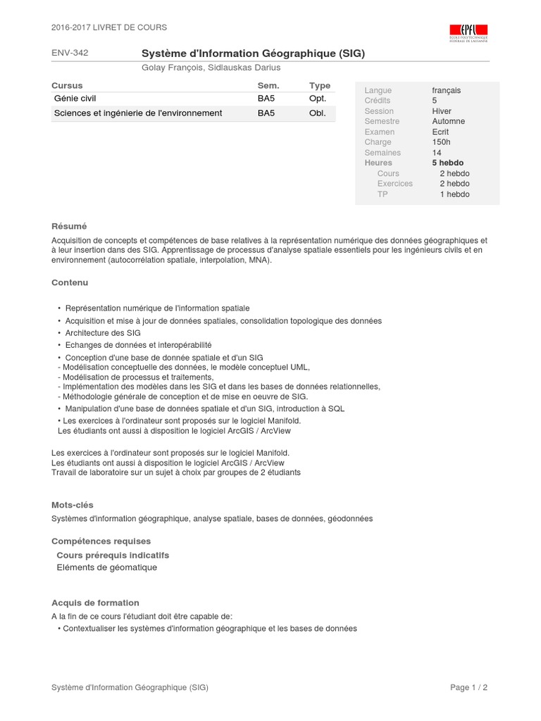 Système d’Information Géographique Course ID UEF 31 Campus Département Informatique Level Master Semester Semestre 3 Credit 3 Method Cours, TP Objectifs de l’enseignement Initier l’étudiant(e) aux différents concepts et outils de gestion et d’analyse des données géographiques, participer à la réalisation, et l. Systèmes d'information géographique, analyse spatiale, bases de données, géodonnées Compétences requises Cours prérequis indicatifs Eléments de géomatique Acquis de formation A la fin de ce cours l'étudiant doit être capable de Contextualiser les systèmes d'information géographique et les bases de données. Système d'Information Géographique (SIG) Les bases ;.