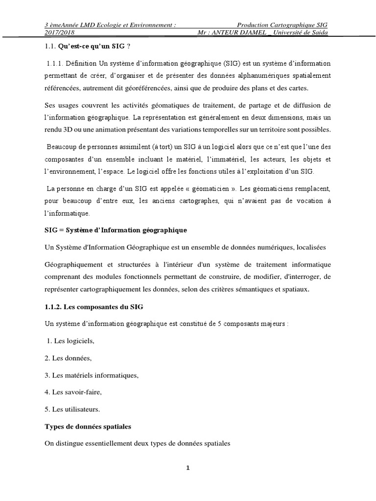 Systèmes d'information géographique, analyse spatiale, bases de données, géodonnées Compétences requises Cours prérequis indicatifs Eléments de géomatique Acquis de formation A la fin de ce cours l'étudiant doit être capable de Contextualiser les systèmes d'information géographique et les bases de données. Système d'Information Géographique HAL Id cel https//halarchivesouvertesfr/celv2 Submitted on 18 Nov 18 HAL is a multidisciplinary open access archive for the deposit and dissemination of sci entific research documents, whether they are pub. Yacine Kouba Cours de système d'information géographique Master Aménagement urbain, Université Larbi Ben M'hidi OEB, Algérie 18, pp105.