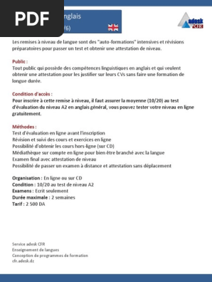 Des adultes ayant suivi des cours d'anglais dans un contexte scolaire et/ou universitaire auparavant mais qui n'ont pas ou peu bénéficié. Notre test d'anglais gratuit obtenez vos résultats immédiatement et placezvous sur l'échelle de niveau européen CECRL pour découvrir à. De valoriser directement tes efforts pour parler et.
