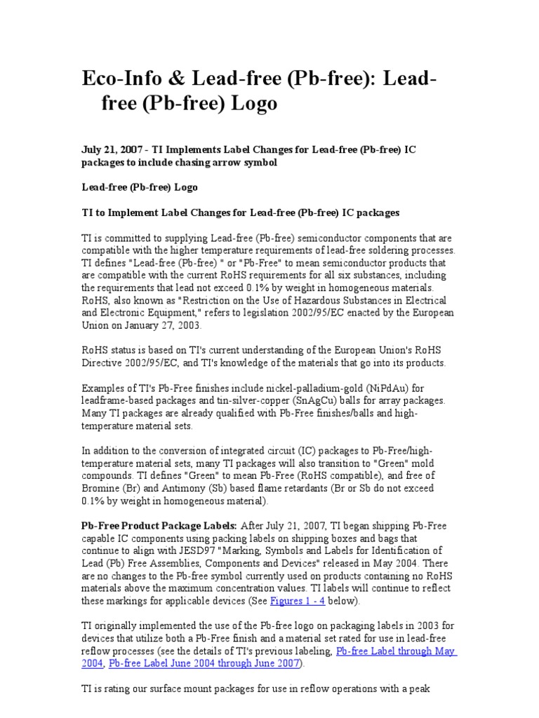 Search results for rohs lead free logo vectors We have 226 free rohs lead free vector logos, logo templates and icons You can download in AI, EPS, CDR, SVG. Lead Free Solder Reflow for Semiconductor Power Devices The solders used in the Electronic Industry are rapidly converting from Tin/Lead (Sn/Pb) solders to LeadFree (PbFree) solders to meet new environmental and Green requirements Many of these requirements are controlled by laws and regulations, which vary by country and application. 36 Pbfree category A category assigned to Pbfree components, boards, and assemblies indicating the general family of material used for the 2nd level interconnect including solder paste, lead/terminal finish, and terminal material/alloy solder balls 37 Pbfree identification label A label that indicates that the enclosed components, devices,.