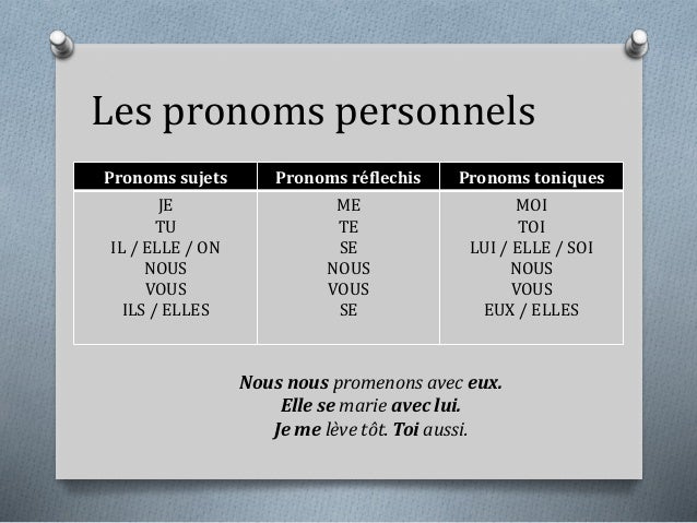 Pour télécharger et imprimer en PDF gratuit cette page d’exercice en anglais, cliquezici !. Les pronoms personnels et complément 1/ les pronoms personnels sujets (ou pronoms sujet) En français, les pronoms personnels sujets sont je, tu, il, elle, nous, vous, ils, elles, me, moi, te, lui, le, leur, eux Ils servent à remplacer un nom Pratique si on ne veut pas le répéter encore et encore Même chose en anglais !. We use personal pronouns to replace nouns They refer to people and things that have already been mentioned, and reflect grammatical gender, person and number Personal pronouns can be the subject or the object of the sentence and can take different forms depending on their role Learn about personal pronouns in French with Lingolia, then practise in the free exercises.
