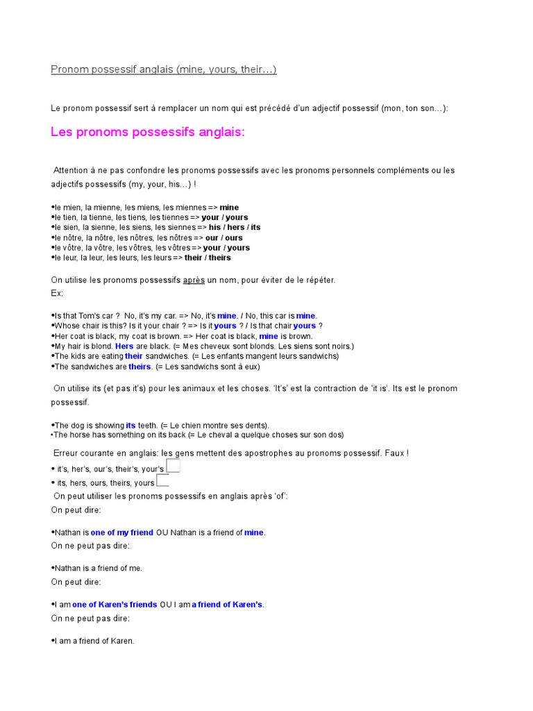 Les Pronoms Personnels Et Les Possessifs Adjectifs Et Pronoms Anglais