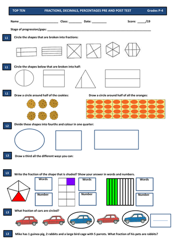 Fractions Decimals Maths Test Pre And Post Assessment For All Primary Years 1 2 3 4 5 6 Teaching Resources