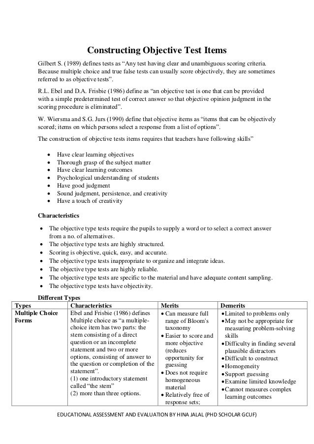 Educational Assessment And Evaluation Constructing Objective Test It