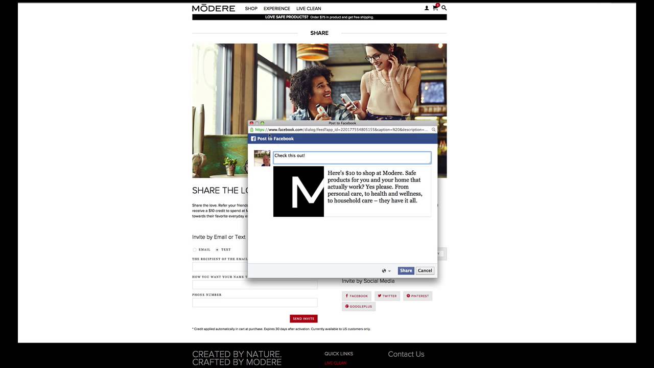 The same way you would do it via their Share the Love page when logged in. Share the love Earn $10 or more credits Share Modere with a friend SHARE NOW Valid for firsttime customers only Share the Love credits are limited to one per household Maximum $10 savings when combining SmartShip & Save with Share the Love. Please remember that an Indian Social Marketer with no downline is only eligible to receive Share The Love credits When will Share The Love Live Clean Credits be generated for India?.