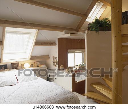 Divan Lit Au Dessous Velux Fenetre Dans Grenier Conversion Chambre A Coucher A Pin Escalier Banque D Image U Fotosearch