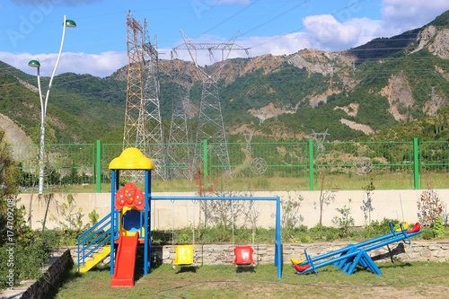 Playground Of A Camping Site And Huge Power Poles Besides A Hydroelectric Power Plant In The Mountains In The Village Koman North Albania Southeast Europe Buy This Stock Photo And Explore