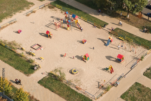 Children Playground Children S And Sports Grounds In The Courtyard Of New Buildings In Europe Top View Aerial View Of American Playground With Slides Swings Buy This Stock Photo And Explore Similar