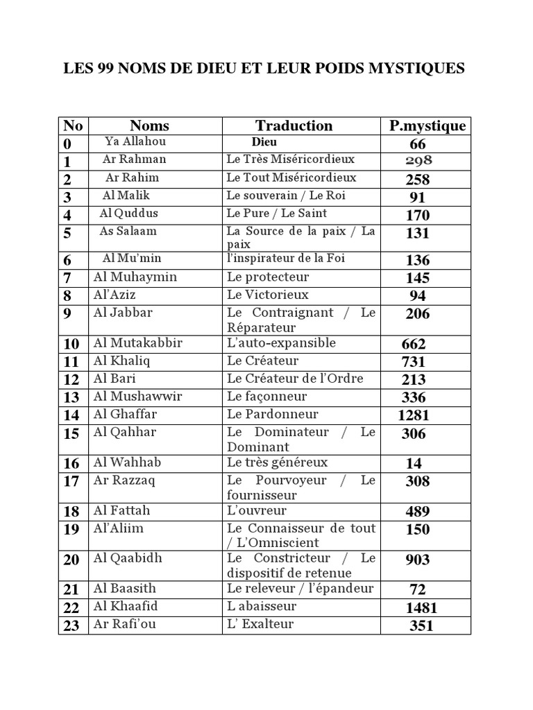 Les 99 Noms De Dieu Et Leur Poids Mystiques Service Homonymie Secteurs Du Service