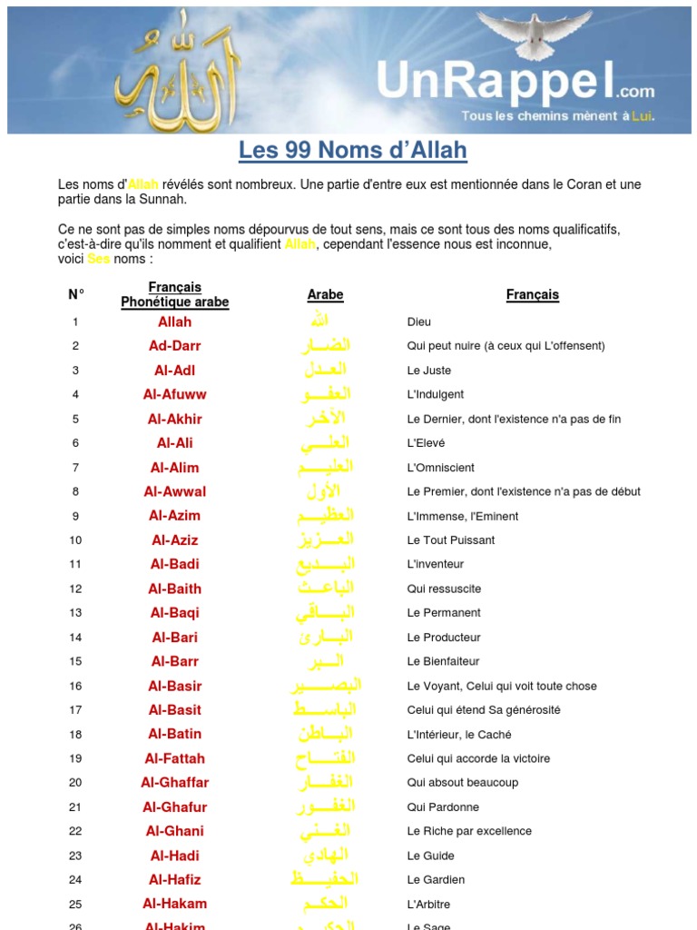 L'APBIF vous offre l'explication de 99 noms parfaits de Dieu en français (أسماء الله). La dénomination de Dieu dans l'islam se fait par 99 noms Outre l'appellation d'Allah, qui signifie littéralement « le Dieu », ou dieu, plusieurs autres noms sont utilisés dans le Coran pour nommer Dieu De plus, un hadith mentionne ces noms Ils sont appelés en arabe أسماء الله الحسنى, c'estàdire « les plus beaux noms de Dieu », tandis que les attributs de Dieu sont appelés صفات الله. LE SECRET DES 99 NOMS d'ALLÂH (Asmaoul housna) !!!!YA RAHMAN 100 fois après Al Fajr ALLAH lui donnera une bonne mémoire et le débarrassera de toute peineYA RAHIM 100 fois après Al Fajr, pour bénéficier de la sympathie de tout le mondeYA MALIK celui qui le répète tout le temps, aura le.