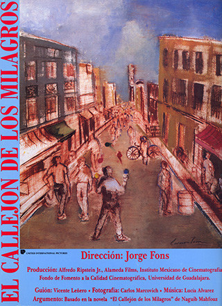 El callejón de los milagros (Midaq Alley en Estados Unidos y Miracle Alley en Australia) es una película mexicana dirigida por Jorge Fons y basada en la nove. El callejón de los milagros, en pleno centro de la ciudad de México, es el escenario donde se entrecruzan las vidas de varios personajes, todos ellos con una historia que contar Cansado de su matrimonio con Eusebia, el cincuentón don Ru, dueño de la cantina del barrio, descubre nuevos y extraños sentimientos en su vida. Ambas trasladan de modo muy creíble el ambiente social y humano de El Cairo a México DF y presentan la visión parcial de unas vidas humanas, centrada en barrios periféricos un callejón, desamparadas, y marcadas por una especie de ciego destino Hay en El Callejón de los Milagros humor y ternura;.