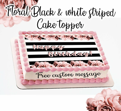 Floral Black And White Stripes Edible Image Frosting Sheet Cake Topper Custom Ebay