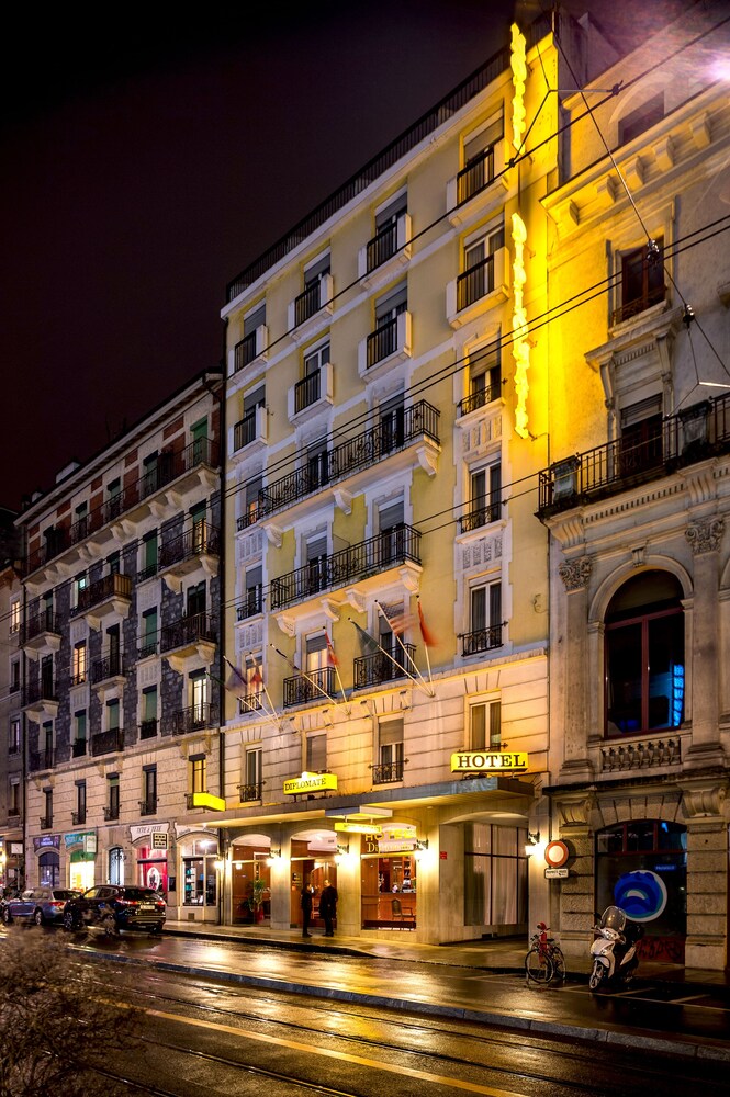 Hotel Diplomate Geneva permits guests who are a minimum of 18 years old Its located in the city center next to the City Center Shopping Area There is a bus stop exactly in front of the hotel The hotel is 87 km from Geneva International Airport The interiors of the hotel and the picturesque accommodations leave guests amazed. Guests rated location Based on verified reviews from guests who stayed at this property Convenient 29 positive mentions 29 guests said the location is convenient Walkable. Located in Les EauxVives, Hotel Diplomate is a leisurely stroll from popular sights such as Flower Clock and Jet d'Eau Fountain This 46room, 4star hotel welcomes guests with conveniences like free inroom WiFi, dry cleaning/laundry services, and laundry facilities.