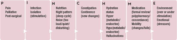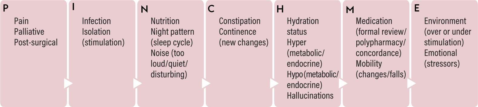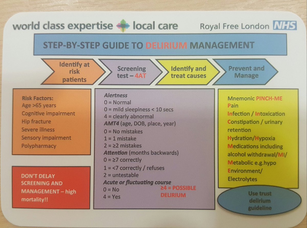 using PINCH ME can help identify other potential underlying causes of delirium superimposed on dementia It can be used in different clinical settings28C 29Cdelirium management Advise watchful. Identifying and managing Pain has the patient received sufficient pain relief Treating underlying INfection Treating and preventing Constipation and provide adequate attention to poor nutrition, monitor for urinary retention avoiding catheters if at all possible Prevent and treat deHydration Review Medication and prevent withdrawal Remember that Environmental changes can increase the severity of delirium. 211 Delirium is a state of mental confusionthat can happen if a person becomes unwell, characterised by acute onset It is therefore also known as ‘Acute Confusional State’ 212 Delirium is a nonspecific sign of illnesswhich usually occurs in vulnerable patients – the frail, the oldestold and those with comorbidities.