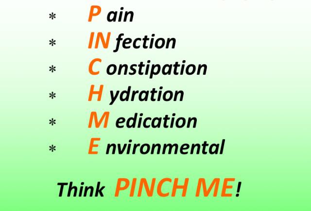 Delirium Top Tips 1 LOOK CAREFULLY FOR DELIRIUM 2 HARNESS THE POWER OF THE FAMILY 3 FIND/STOP CULPRIT MEDS 4 ORIENTATE YOUR PATIENT Infographic by Dr Linda Dykes @DrLindaDykes based on original document by Dr Dan Thomas @dan26wales #Diagnosis #Management #Geriatrics #Delirium #Tips #Guidelines #PINCHME #Mnemonic. A simple mnemonic called PINCH ME (Pain, INfection, Constipation, deHydration, Medication, Environment) can help identify potential underlying causes of DSD and considerations for care planning. New initiatives have included embedding of the PINCH ME mnemonic into the electronic computer system development of delirium guidelines and a quick reference guide for the trust intranet, regular teaching sessions for rotating members of the MDT, and regular publicity campaigns (often centred around national events such as National Delirium Day).