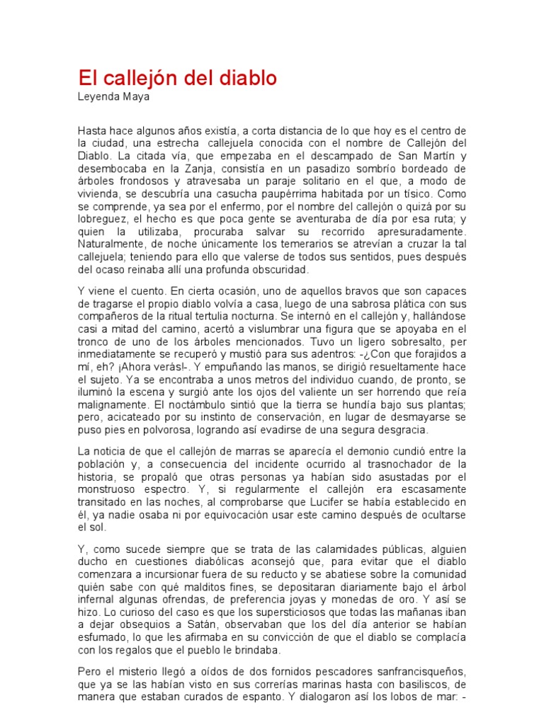 Leyenda El Callejón del Diablo Campeche Leyendas Cortas Leyenda del Estado de Campeche Esta leyenda surge de una callejuela que empezaba en San Martín y desembocaba en la Zanja, consistía en un pasadizo sombrío bordeado de árboles donde vivía un hombre con malformaciones. Callejon del diablo Callejon del diablo La leyenda cuenta que un hombre escéptico ante los rumores, un buen día se animó a caminar por ahí No llevaba ni la mitad del callejón recorrido cuando vio una sombra detrás de un árbol, pero eso no lo detuvo y continuó su camino Otras versiones de la leyenda cuentan que el diablo se. Alrededor de este callejón hay distintas historias, por lo cual se le atribuye dicho nombre, sin embargo, cuenta la leyenda más conocida que un hombre, sin temor a nada, decidió ir en la noche.