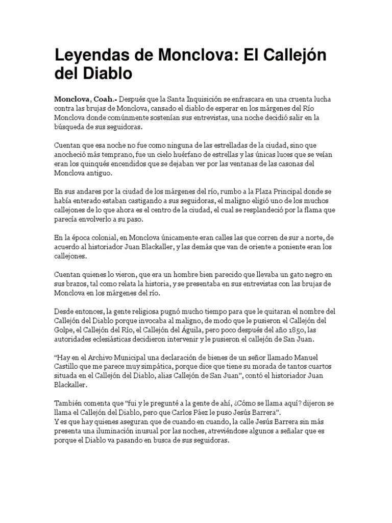 Curiosamente hasta la fecha no habíamos dedicado un artículo en exclusiva a este famoso enclave toledano En otras ocasiones hemos tratado de forma extensa la presencia del maligno tanto en el callejero como en las leyendas y mitos de la Ciudad de las Tres Culturas, pero no habíamos narrado la procedencia del callejón del Diablo Vamos a ello. Otra versión de la leyenda del Callejón del Diablo en la zona centro de Monclova, es que en una madrugada, en tiempos de la Colonia, unos hombres estaban jugando a la baraja en una casona en lo que ahora es la calle Barrera, que conduce al parque Xochipilli I, pero antes topaba con el Río Monclova. CALLEJÓN DEL DIABLO La leyenda cuenta que un hombre escéptico ante los rumores, un buen día se animó a caminar por ahí No llevaba ni la mitad del callejón recorrido cuando vio una sombra detrás de un árbol, pero eso no lo detuvo y continuó su camino.