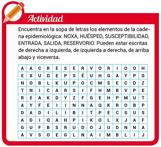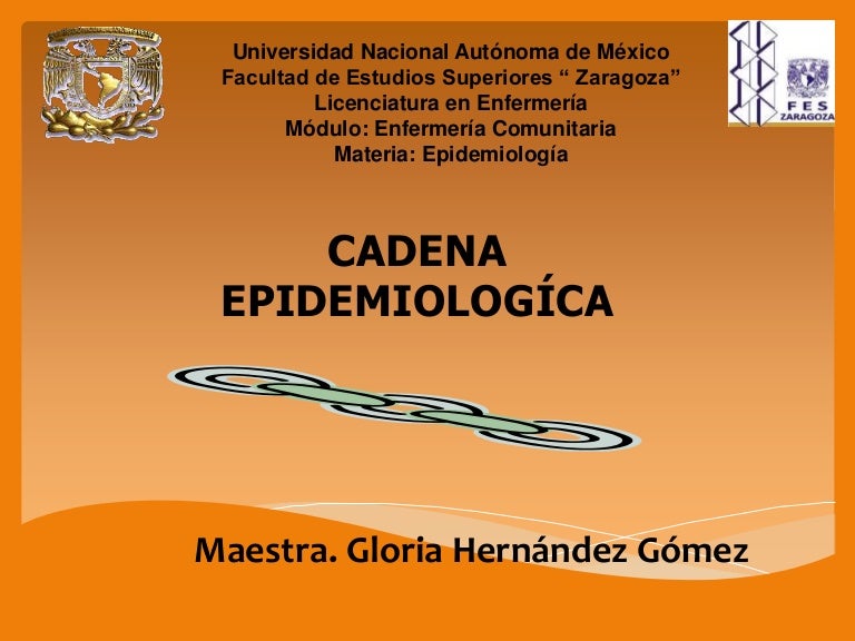 Many translated example sentences containing "la cadena epidemiológica" – EnglishSpanish dictionary and search engine for English translations. La cadena epidemiológica, también conocida como la cadena de infección, es un modelo que determina cada uno de los eslabones que intervienen en el mecanismo de transmisión de una enfermedad Su finalidad es la de identificar dónde se puede actuar, determinar qué medidas de prevención y control aplicar. 03 Cadena Epidemiológica Listado de subpáginas La transmisión de agentes infecciosos en un centro sanitario requiere 3 elementos 1 Fuente o reservorio;.