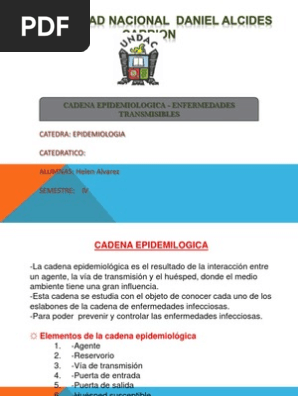 Introducción La cadena epidemiológica es el resultado de la interacción entre un agente, la vía de transmisión y el huésped, donde el medio ambiente tiene una influencia más o menos importante, porque obviamente tanto la gente como el huésped están insertos en un medio ambiente y la vía de transmisión se hace también en el medio ambiente. View Cadena epidemiologicapdf from BIOLOGIA 1 at Federico Villarreal National University CADENA EPIDEMIOLÓGICA La cadena epidemiológica o cadena infecciosa es el conjunto de elementos o. Como podemos apreciar, hay al menos tres eslabones que son idénticos Las diferencias residen en que la cadena de 6 eslabones simplifica el Reservorio y la Fuente (que suelen ser la misma) y desarrolla el Mecanismo de Transmisión en tres eslabones (Puerta de salida, Vía de transmisión y Puerta de Entrada).