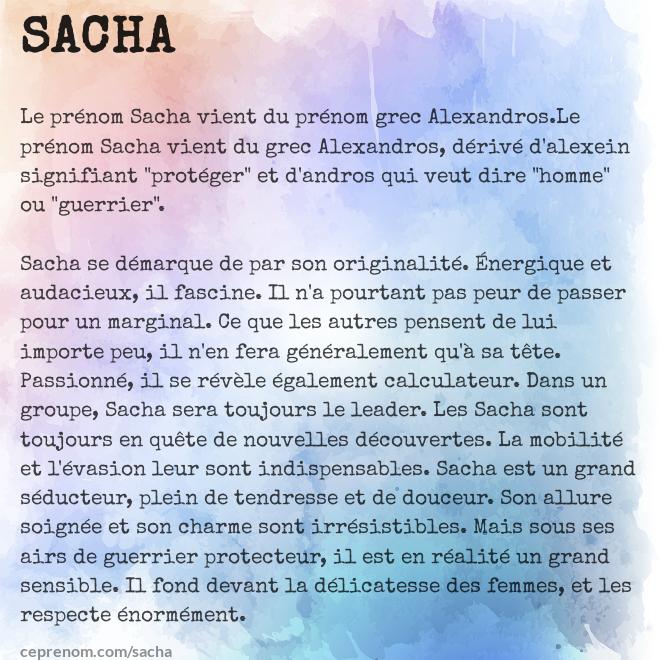 Le prénom a aussi un rôle de projetEn effet les prénoms hébreux ont une signification, même les prénoms modernes,dans leur grande majorité,et il semble que l'un des critères pour le choix d'un prénom soit justement son sensIl existe bien sur un grand nombre d'autres critères,comme la volonté d'honorer ou de prolonger la mémoire. Commentaire Pseudo Date Sacha la fille, tu portes un prénom masculin !. 1Origines du prénom Le prénom Sacha est la version russe du prénom Alexandre, luimême tiré du grec AlexandrosCeluici mélange les mots grecs « alexein », signifiant repousser », et « andros », traduit par « viril » ou « homme »Il peut ainsi être interprété par « défenseur des hommes », ou « qui repousse les hommes », incarnant dans tous les cas une figure de guerrier.