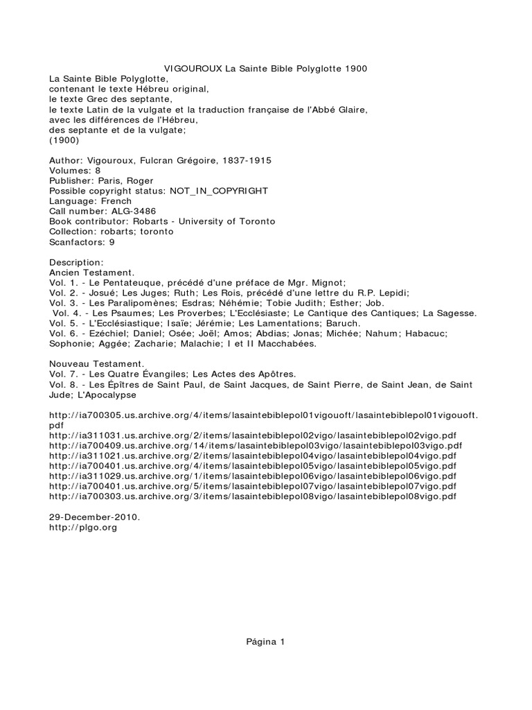Vigouroux La Sainte Bible Polyglotte Hebreu Grec Latin Et Traduction Francaise 1900 Vol 01 Dieu Bible