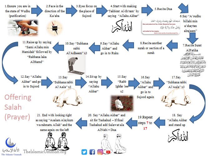 This salaat can be performed in the same manner as Subh prayer except that the Niyyat (Intention) is different However it is more recommended to perform this salaat in the method taught by Imam Ja’farasSadiq (AS) as follows 1st Rakat SuraAlHamd followed by SuraAlQadr 2nd Rakat SuraAlHamd follewed by SuraAlKawthar. The salah or salat prayer ritual is the second Pillar of Islam The sequence of movements that comprise the salat prayer is called Rakat Muslims will take part in salat five times a day. Learn how to pray with Rami step by step video The most easy and simple way to teach kids salah (Prayer) Just let Rami show how to pray in this animated.