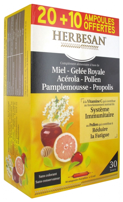 Herbesan Miel Gelee Royale Acerola Pollen Pamplemousse Propolis Ampoules 10 Offertes
