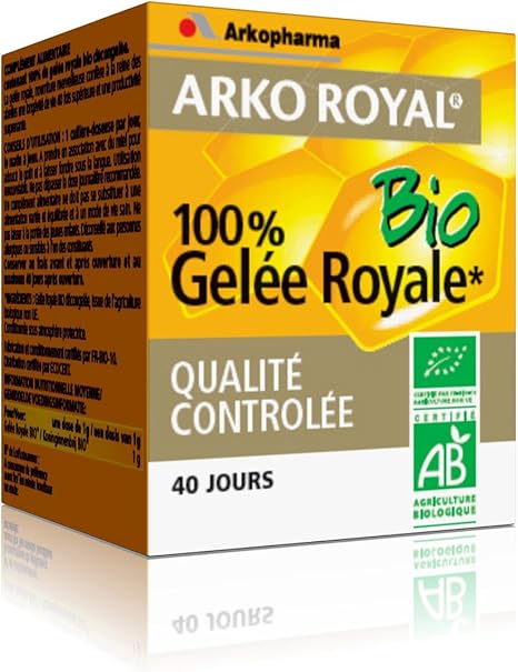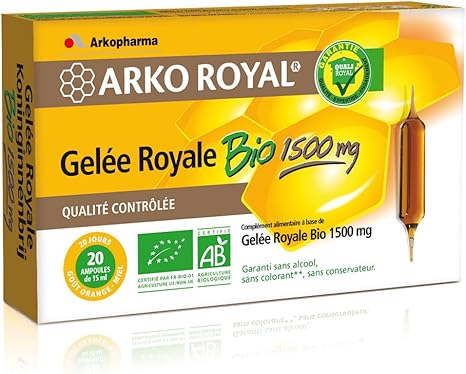 Arkopharma Arkoroyal Gelée Royale 1000mg x Ampoules est un complément alimentaire qui aide les défenses immunitaires pour une longévité de vie 40 fois supérieure à la normale Sa formule sans alcool, sans colorant et sans conservateur contient de la gelée royale fabriquée par les abeilles et un délicieux goût orangemiel. La gelée royale à de nombreux bienfaits sur le corps Contre les problème respiratoire Énergisant Stimule la circulation sanguine Augmente le poids corporel Augmente la croissance des enfants Traiter les troubles sexuels et menstruels Conseils d’utilisation Vous pouvez prendre 1 mesure rase par jour, à diluer dans un verre d’eau Contenance 10g. Consultez la traduction allemandarabe de Gelée Royale dans le dictionnaire PONS qui inclut un entraîneur de vocabulaire, les tableaux de conjugaison et les prononciations.