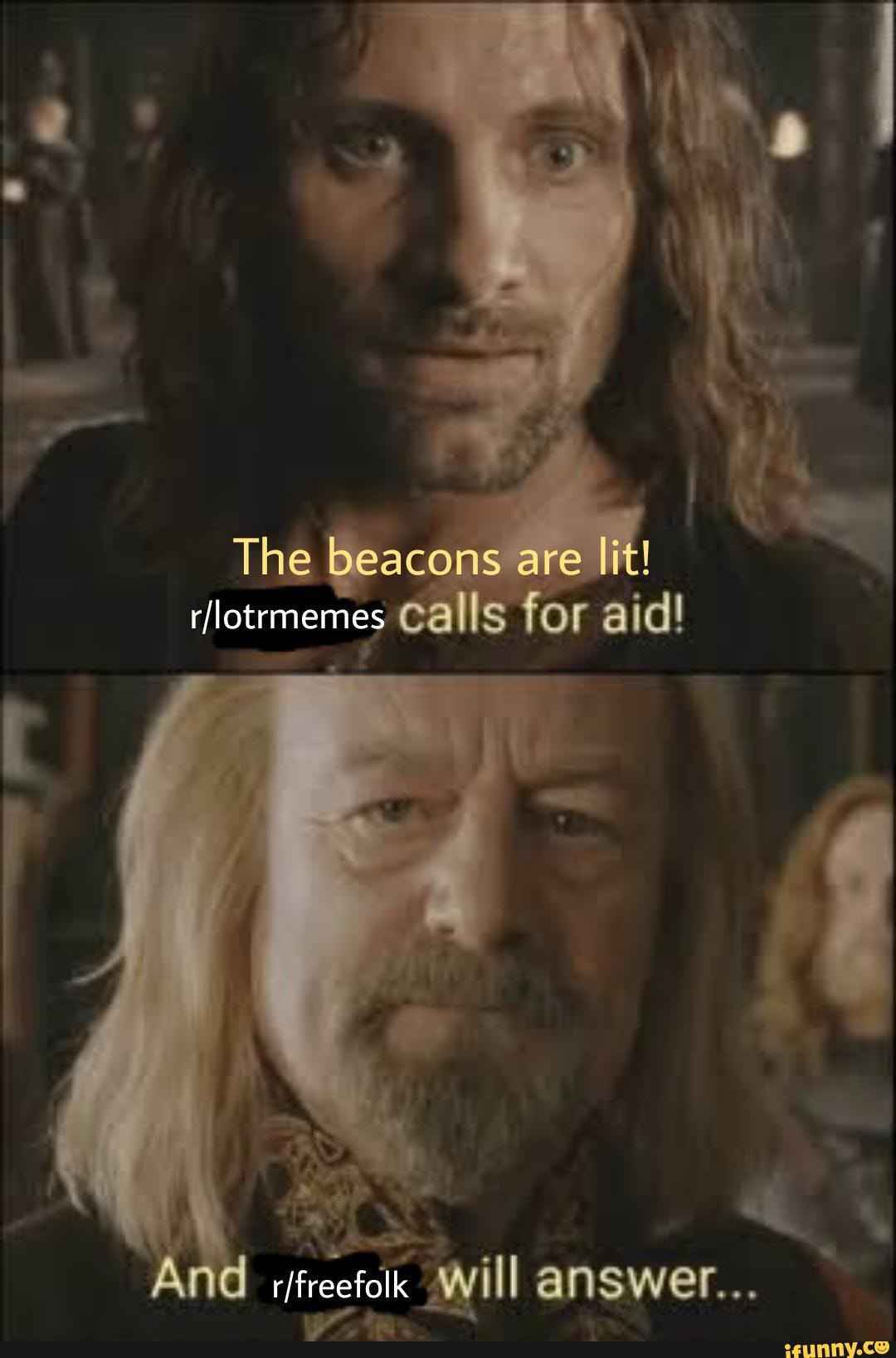 The beacons are lit gondor calls for aid the beacons are lit Meme Generator ️ Generate ⭐ Top Kek Login;. The Beacons Are Lit Meme Generator The Fastest Meme Generator on the Planet Easily add text to images or memes. During the War of the Ring the beacons were lit when Minas Tirith came under siege, and as the Rohirrim rode to Gondor's aid they passed all seven beacons by on their way east The tomb of Elendil was hidden on the summit of Halifirien, westernmost of the beacon mountains Portrayal in adaptations 03 The Lord of the Rings The Return of the King.