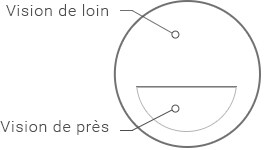 Ces verres bifocaux sont destinés à une personne ayant besoin de deux corrections une pour la vision de loin, une pour la vision de près La partie supérieure du verre corrige la vision de loin tandis que la zone inférieure corrige la vision de près.