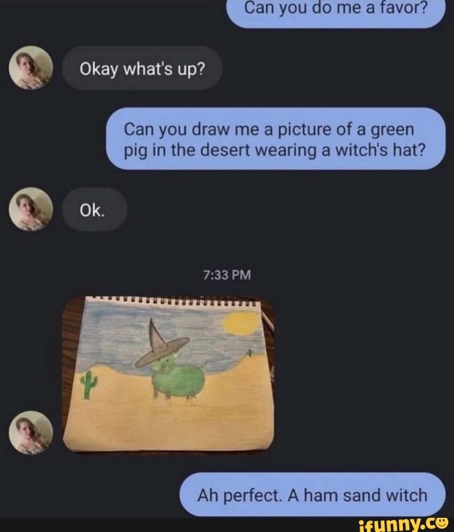 Today 9 Pm Can You Draw Me A Ham Sand Witch Mmm A Green Pig In A Desert In A Witches Hat 个 Text Message Me Irl Text Meme On Me Me