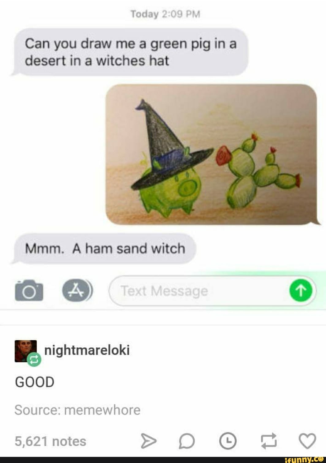 Can You Draw Me A Green Pig In A Desert In A Witches Hat Mmm A Ham Sand Witch Nightmareloki Ifunny