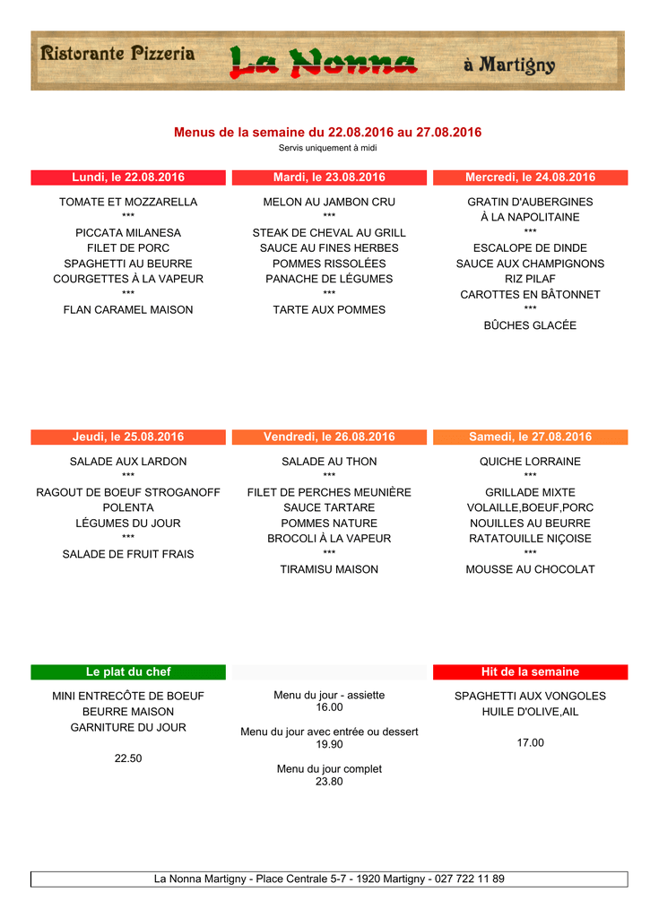 Details von la Nonna in Martigny (Adresse, Telefonnummer, Homepage) Restaurant Pizzeria La Nonna Aigle Menu du jour Ristorante Pizzeria La Nonna Aigle Monthey Martigny Accueil Propositions du jour Menus cette semaine (PDF) Carte de saison Carte.