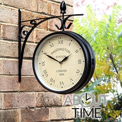 Paddington Station Weather Resistant Double Sided Garden Outdoor Wall Clock With Black Metal Casing Design Outside Waterproof By About Time Amazon Co Uk Kitchen Home