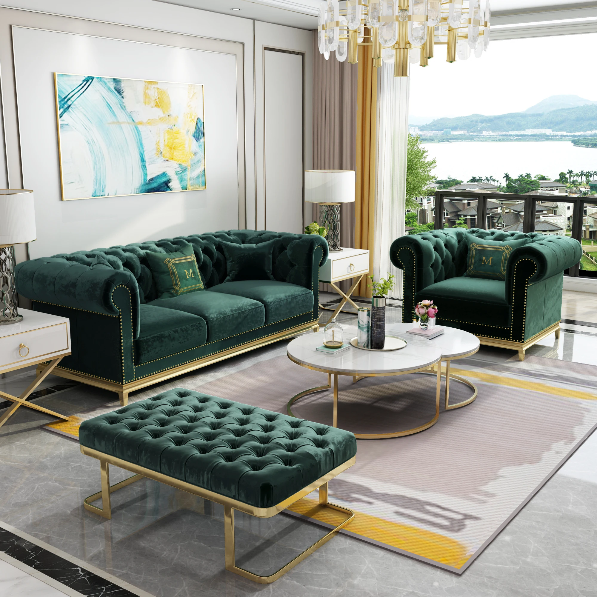 Spanje Ontwerp Woonkamer Sofa Set Geel Blauw Fluwelen Enkele Drie Seat Chesterfield Sofa Salon Couch Sier Stitch Capito Woonkamerbanken Aliexpress