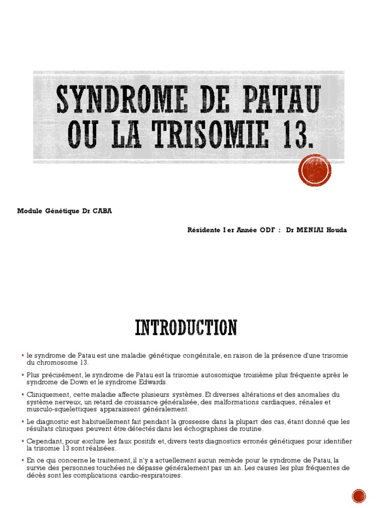 Trisomie 13 syndrome de patau. Trisomy 13, also called Patau syndrome, is a chromosomal condition associated with severe intellectual disability and physical abnormalities in many parts of the body Individuals with trisomy 13 often have heart defects, brain or spinal cord abnormalities, very small or poorly developed eyes ( microphthalmia ), extra fingers or toes, an opening in the lip ( a cleft lip) with or without an opening in the roof of the mouth ( a cleft palate ), and weak muscle tone (hypotonia). The physical features of mosaic trisomy 13 and partial trisomy 13 are often milder than those of full trisomy 13, resulting in more babies living longer In most individuals with Trisomy 13 Syndrome, duplication of chromosome 13 is caused by spontaneous (de novo) errors during the division of reproductive cells in one of the parents (eg. La trisomie 13 (aussi appelée syndrome de Patau) est une maladie génétique dans laquelle une personne dispose de trois copies du matériel génétique du chromosome 13, au lieu des deux habituelles copies Rarement, le matériel supplémentaire peut être attaché à un autre chromosome (translocation) Causes Symptomes Traitement pronostic Prà  à ©vention Terme Maladie.