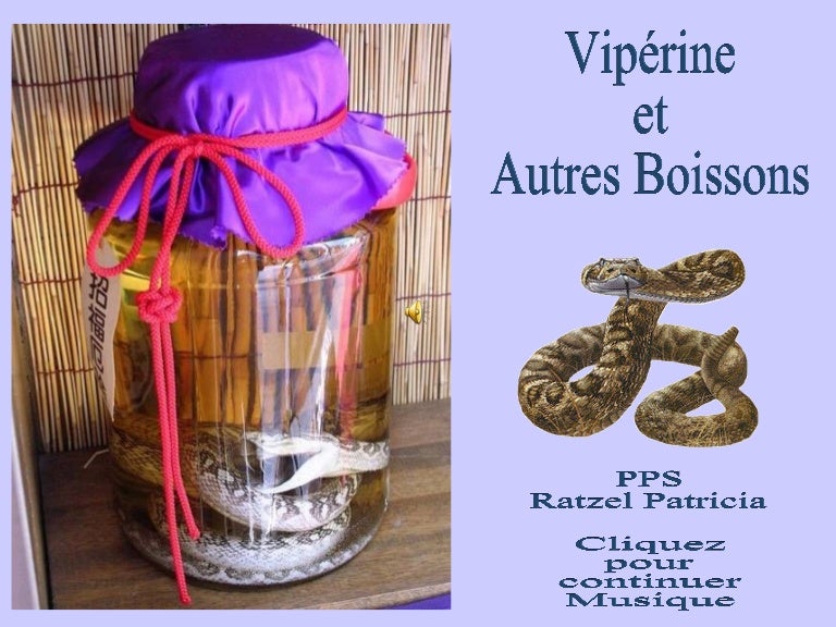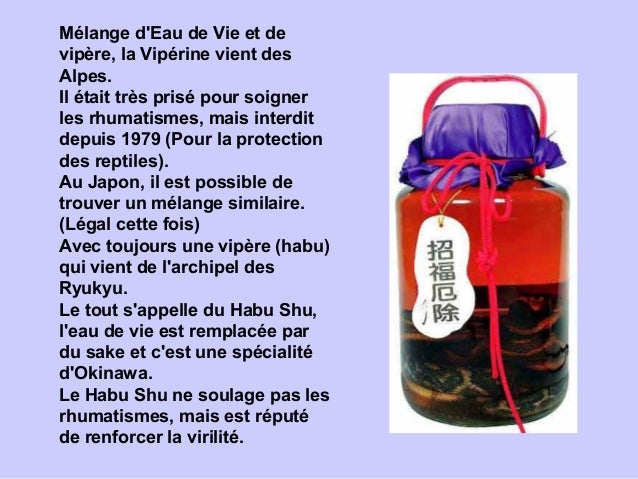 Viperine envenomation Introduction With more than 80% of cases of envenomation by ophidians, vipers represent worldwide a real public health problem, especially in developing countries where medical care is often nonexistent, absent (out of reach) or self made Composition & symptoms. Viperine alcool La vipérine, en plus d'être une plante, est un alcool originaire des montagnes La vipère est introduite vivante dans une bouteille d'eau de vie En se noyant, elle libère son venin et celui ci, mélangé à l'eau de vie, présente des vertus tonifiantes et curatives pour les problèmes de rhumatismes Cet alcool est interdit depuis 1979, date de mise.