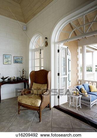 Vieux Fauteuil A Cote De Grand Portes Francaises Ouvert A Veranda De Antilles Maison Banque D Image U Fotosearch