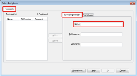 Envoi de fax par saisie du numéro de fax/téléphone Cette section explique comment envoyer des fax directement en entrant les numéros de fax/de téléphone Important Il se peut que des fax arrivent chez des destinataires imprévus en raison d'erreurs de numérotation ou d'un enregistrement erroné de numéros de fax ou de téléphone. Si tiene alguna pregunta sobre qué documentos debe enviar, llame al Centro de Llamadas del Mercado. Enregistrez le numéro de fax/téléphone des destinataires Enregistrez le numéro de fax/téléphone des destinataires en suivant la méthode d'enregistrement choisie En entrant le numéro L'écran servant à enregistrer le numéro de fax/téléphone du destinataire et son nom s'affiche Passez à l'étape suivante.
