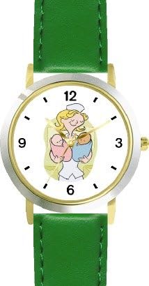 Amazon Com Maternity Nurse With Baby Boy And Baby Girl Watchbuddy Deluxe Two Tone Theme Watch Arabic Numbers Green Leather Strap Size Large Men S Size Or Jumbo Women S Size Watchbuddy Watches
