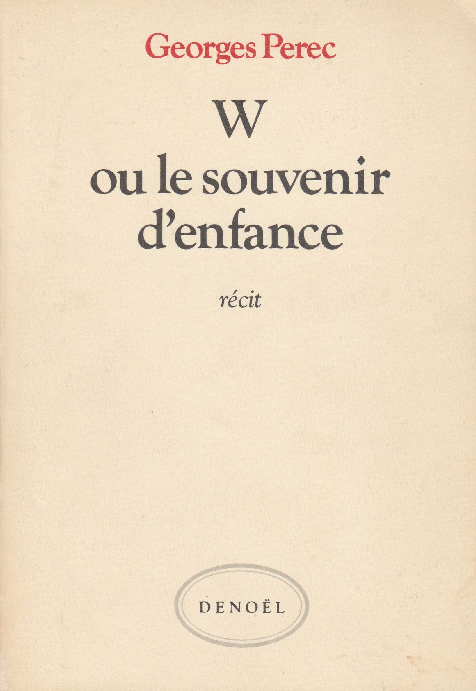 W ou le Souvenir d'enfance est un ouvrage de Georges Perec paru en 1975Le texte est un récit croisé, alternant une fiction (un chapitre sur deux, en italiques) et un récit autobiographique, en apparence très différents Les données autobiographiques, et tout particulièrement la catastrophe vécue par Georges Perec, qui a perdu dans son enfance son père tué au combat en 1940 et sa.