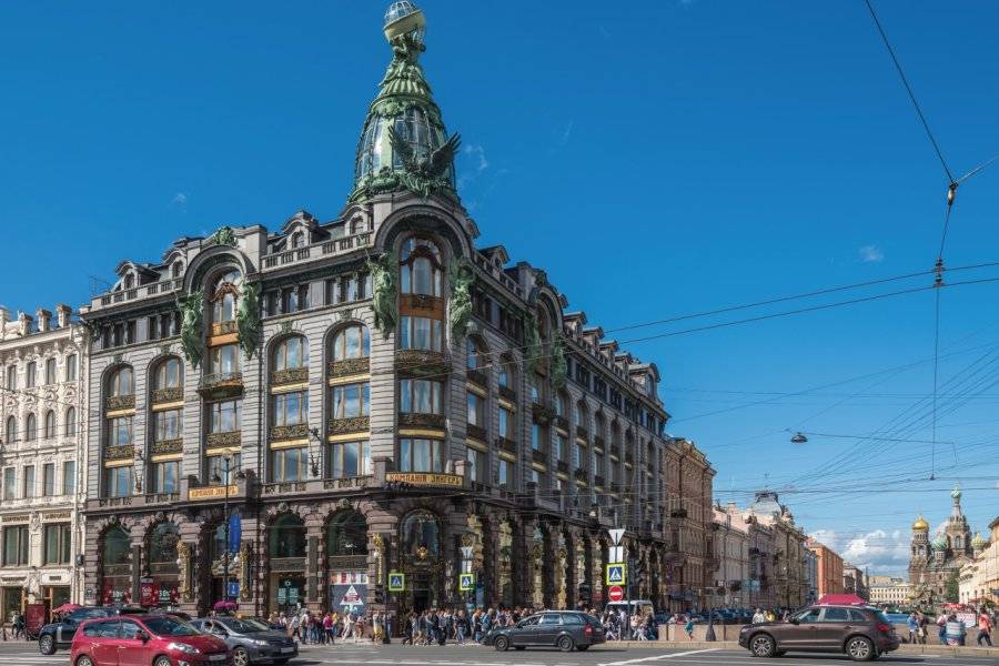 "Ce célèbre bâtiment de la perspective Nevski fut construit pour la compagnie américaine Singer () Celleci désireuse de se faire élever un gratteciel à SaintPétersbourg en fut interdite La hauteur des bâtiments de la ville ne pouvait pas dépasser celle du palais d'Hiver (23,5 m). La ville est aussi réputée pour sa Place des Arts, la Perspective Nevski, l'artère principale Pierre le Grand est célébré avec une magnifique statue équestre Les conquêtes se faisaient toujours à cheval Visitez enfin le monastère Smolny construit pour Elisabeth I, de style baroque élisabethain Pour les amateurs de beaux lieux. La perspective Nevski, qui était la route qui menait à Moscou, se développa rapidement dès 17 Aujourd’hui encore, parcourir la perspective Nevski, « la princesse de notre capitale », c’est un parcours dans le temps et l’art que vous pouvez faire en 2h30, rythmé par les canaux et les ponts.