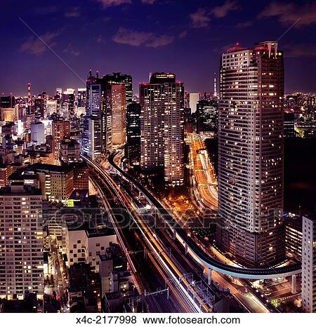 Tokyo City Aerial Nighttime View With Illuminated Highways And Train Lines Minato Tokyo Japan Stock Photo X4c Fotosearch