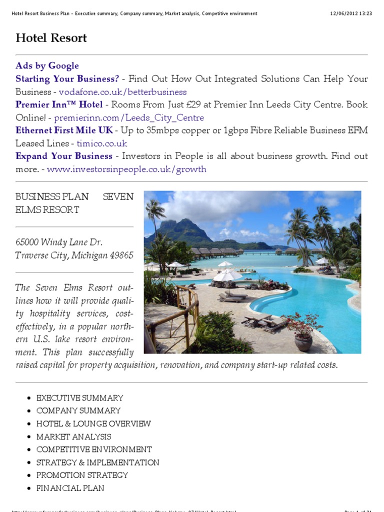 Hotel Resort Business Plan Executive Summary Company Summary Market Analysis Competitive Environment Motel Hotel
