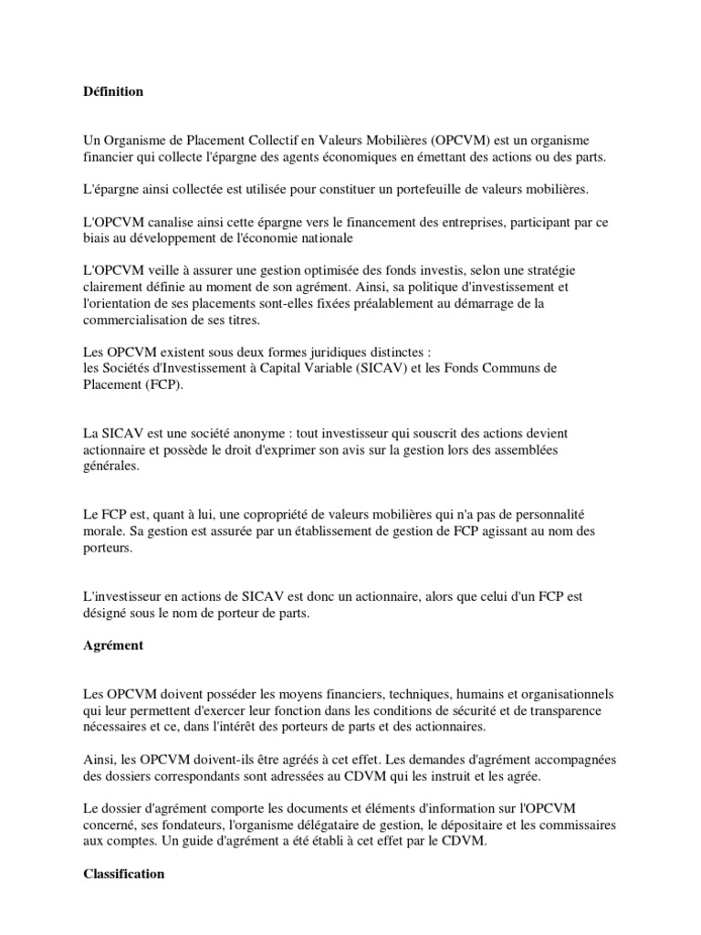 Expose Opcvm V Finale 1 Actionnaire Bourse Des Valeurs