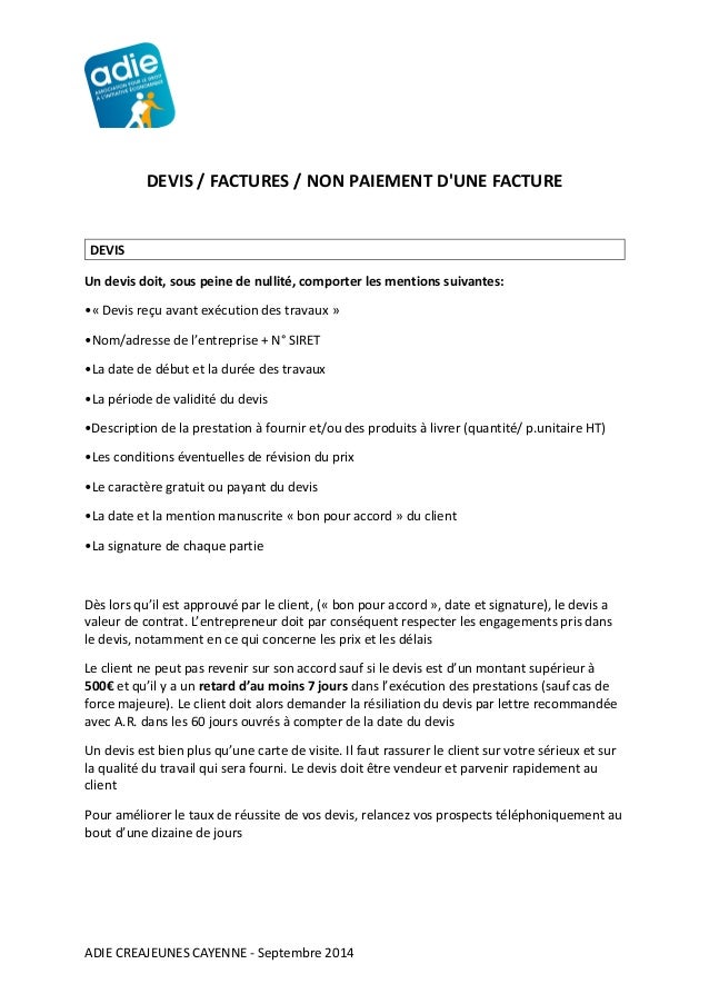 2 Devis obligatoire ou non obligatoire la formation du contrat de vente Que le devis soit obligatoire ou non, il n'engage pas le client Ce dernier a la possibilité. Avec la mention bon pour accord et un acompte de 30 % Une fois la prestation réalisée en toute confidentialité. Explications • Créer un devis • Créer un bon • Créer une facture • Afficher mention TVA non applicable, article 293 B du CGI Conserver vos devis/factures, en assurer le.