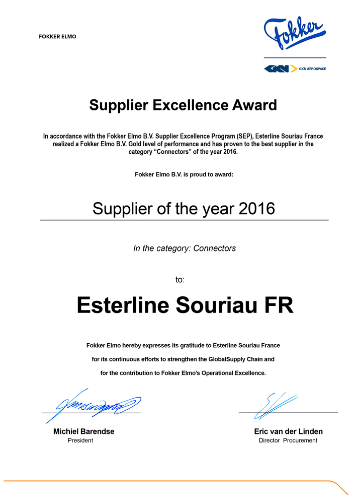 Fokker Best Supplier Award Given To Souriau Esterline Connection Technologies Souriau Sunbank Connection Technologies