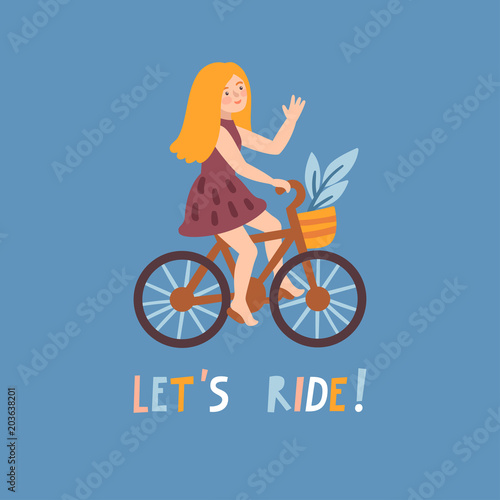 Vector Illustration Of Smiling Woman Riding Bicycle And Text Let S Ride Cute Cartoon Character On The Bike Buy This Stock Vector And Explore Similar Vectors At Adobe Stock Adobe Stock